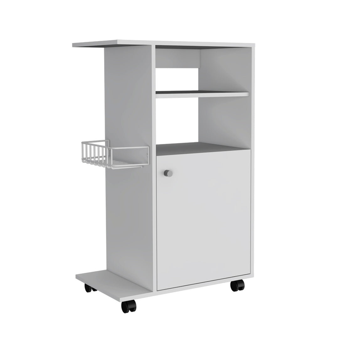 Modern Kitchen Cart 39" H, Single Door Cabinet, Four Wheels, One Side Shelf, White White Particle Board Particle Board