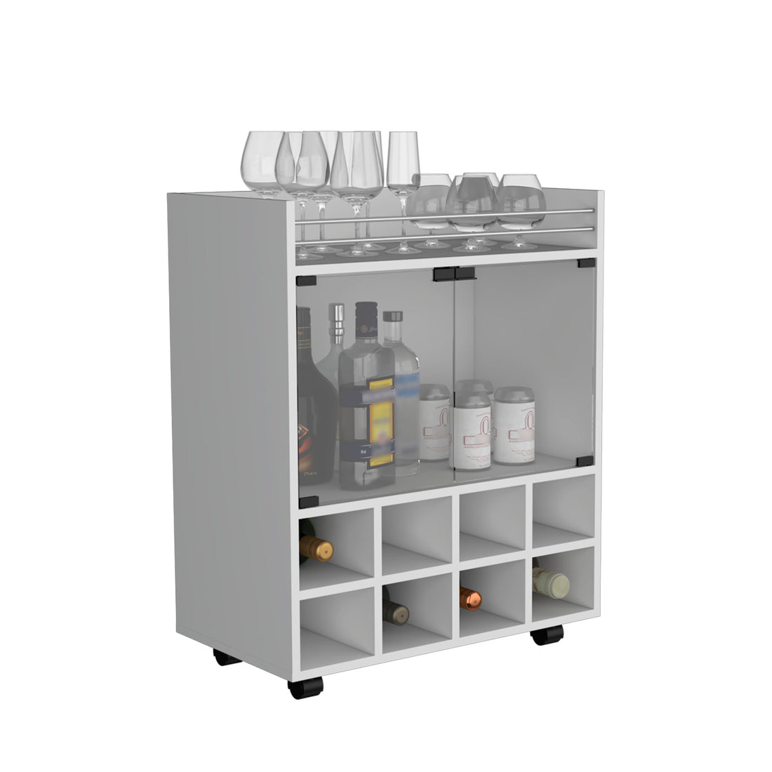 Bar Cart Baltimore, Six Wine Cubbies, Glass Door, Four Caster, Two Shelves, White Finish White Particle Board