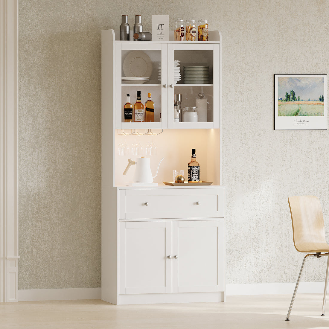 75.2" Tall Kitchen Pantry Storage Cabinet With Lights And Charging Station, Modern Kitchen Hutch Bar Cabinet With Microwave Stand, Wood Buffet Sideboard With 1 Drawer For Kitchen, Dining Room White Dining Room Classic Mdf