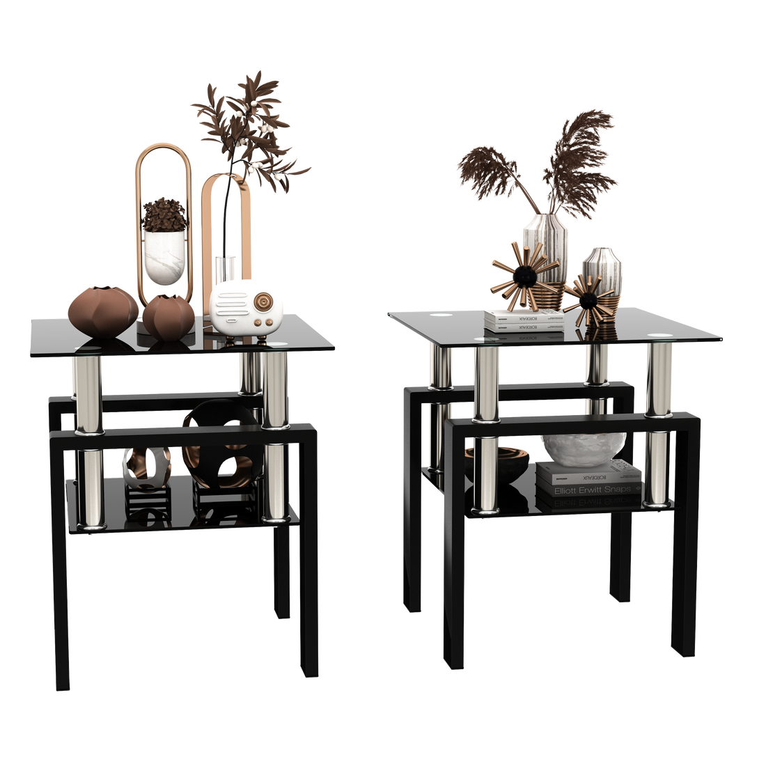 Set Of 2, Modern Tempered Glass Tea Table Coffee Table End Table, Square Table For Living Room, Black Black Tempered Glass