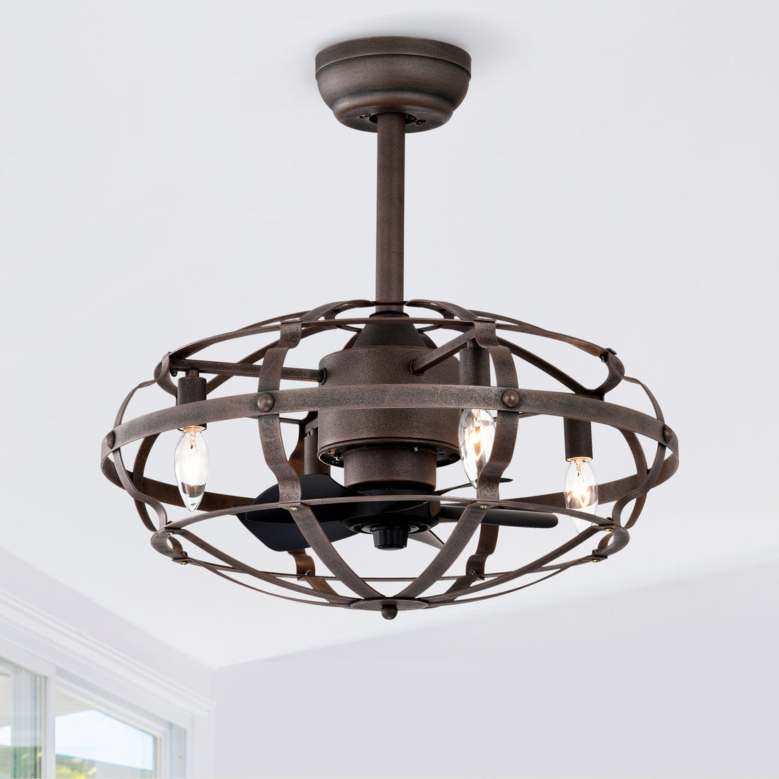 18Inch Caged Ceiling Fan With Lights Remote Control For App Note:No On Bulbs Brown Retro Iron