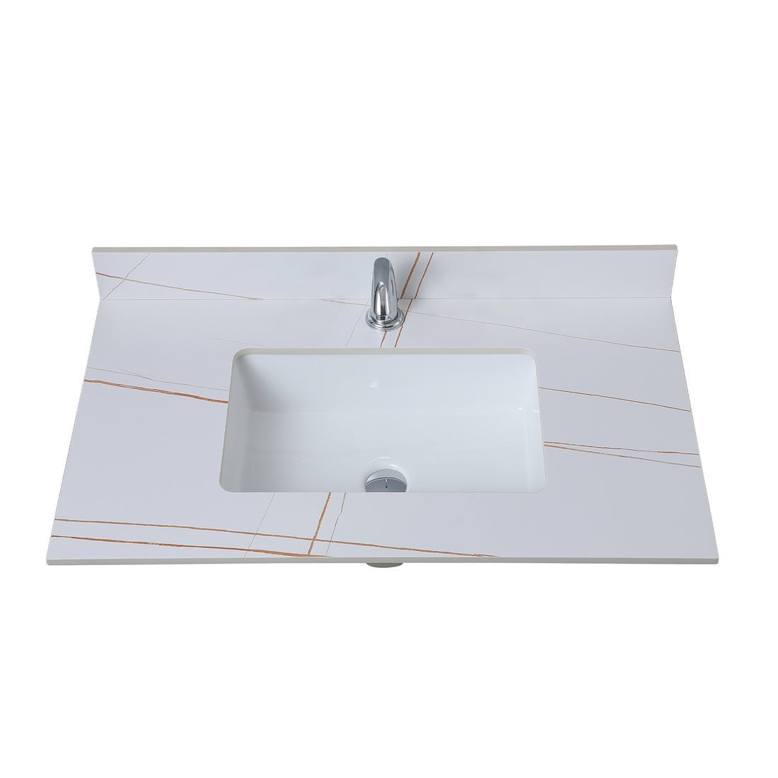 37Inch Bathroom Vanity Top Stone White Gold Style Tops With Rectangle Undermount Ceramic Sink And Single Faucet Hole White Sintered Stone