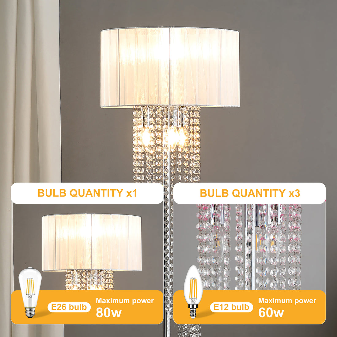 Name: 65.75"h Sheer White Drum Shade Rain Crystal Chrome Metal Floor Lamp for Living Room,...