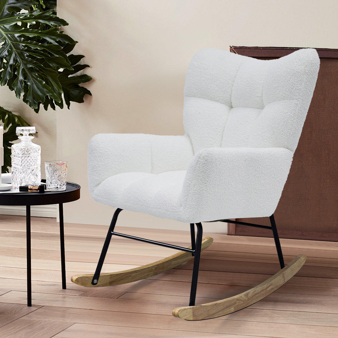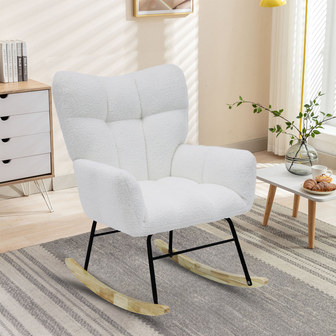 Modern Rocking Chair,Teddy Fabric Chair With High Backrest,Rocking Accent Chairs For Nursery,Living Room,Bedroom White White Wood Metal