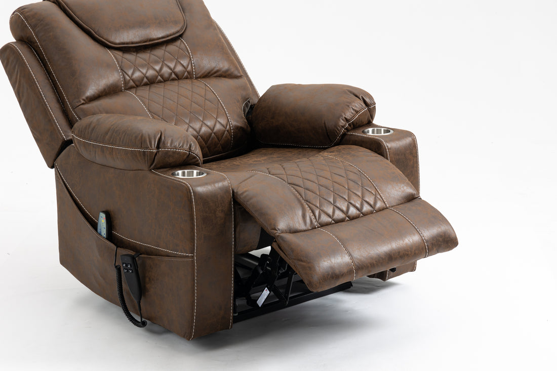 Omarion Power Recliner W Lift, Heating & Massage, Brown Leather Aire Lv02997 Brown Upholstered
