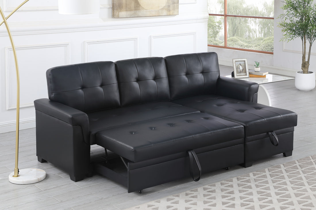 Lexi 83.5" Black Vegan Leather Modern Reversible Sleeper Sectional Sofa With Storage Chaise Black Pu Leather