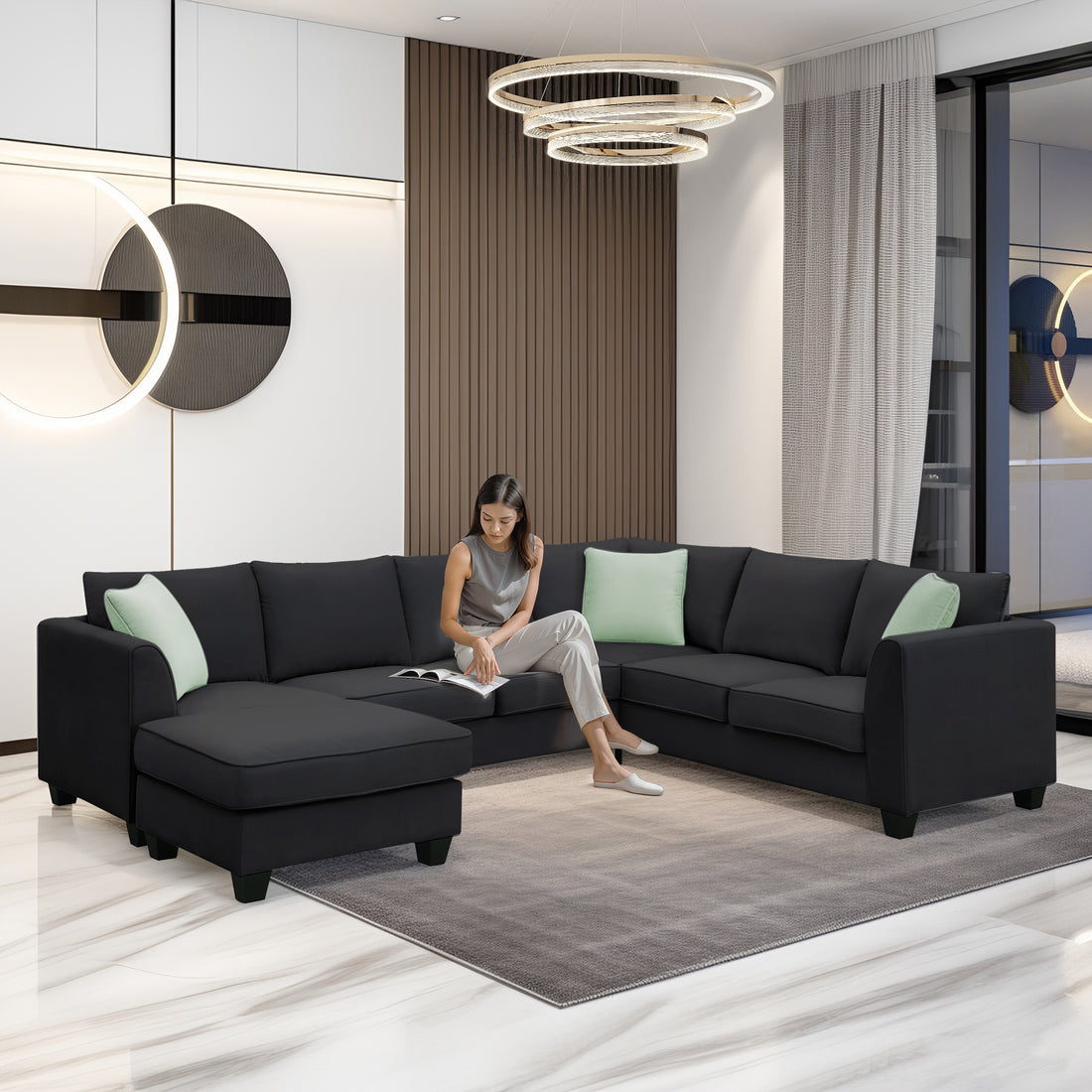 112*87" Sectional Sofa Couches Living Room Sets, 7 Seats Modular Sectional Sofa With Ottoman, L Shape Fabric Sofa Corner Couch Set With 3 Pillows, Black Of Gs008210Aab Black Fabric 7 Seat