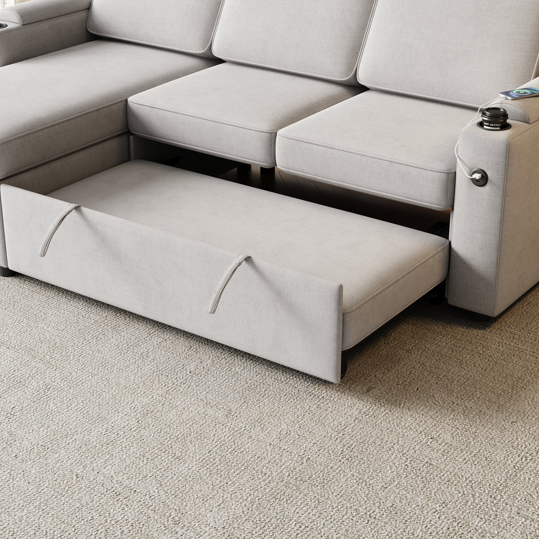 Mh 78.75" Reclining Sofa, Pull Out Sofa Bed With Usb And Tape C Charging Ports, L Shaped Sectional Sofa With Reclining Storage And Arm Side Organizer Pocket Features, Living Room Comfort Sofa Beige