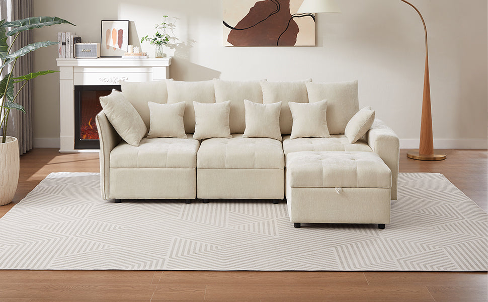 96.45"Sectional Sofa Modular Sofa Couch With Three Usb Ports, A Removable Storage Ottoman And Five Back Pillows For Living Room, Beige Beige Foam Chenille 4 Seat