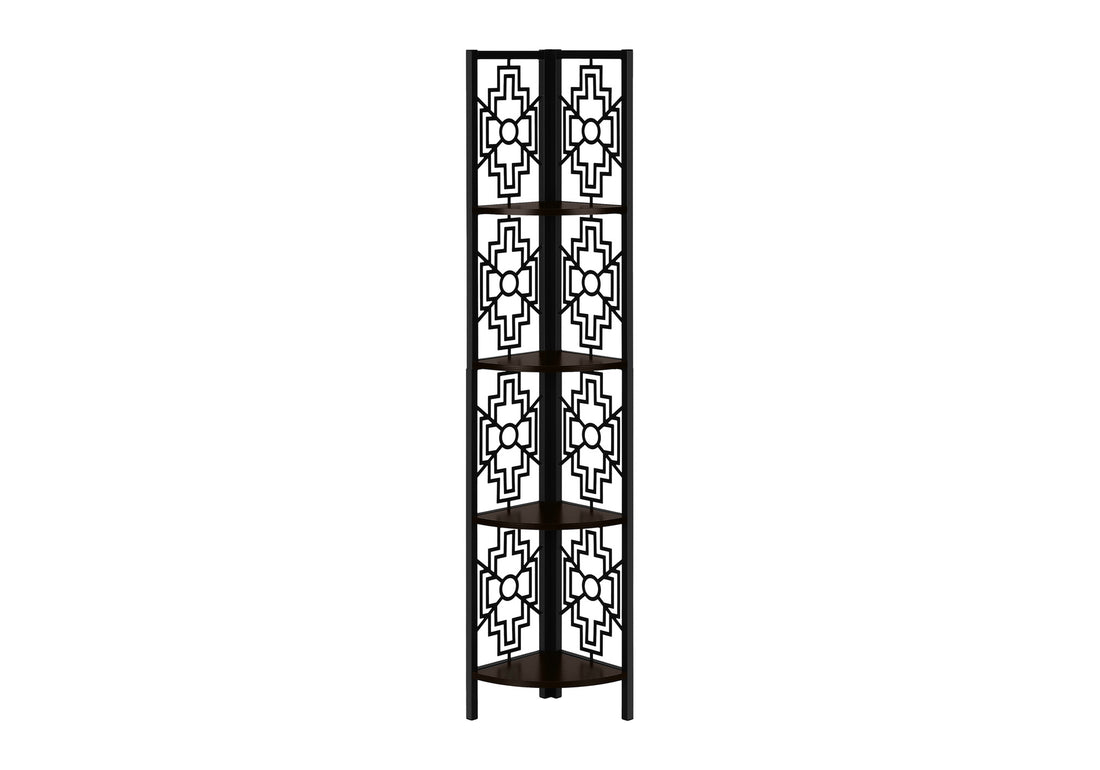 Bookshelf, Bookcase, Etagere, Corner, 4 Tier, 62"H, Office, Bedroom, Brown Laminate, Black Metal, Transitional Espresso Metal