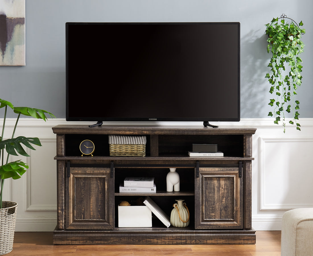 Name: Rustic Barndoor Open-Storage Tv Stand for TVs up to 80 inches Grey Wash Characteristics:...