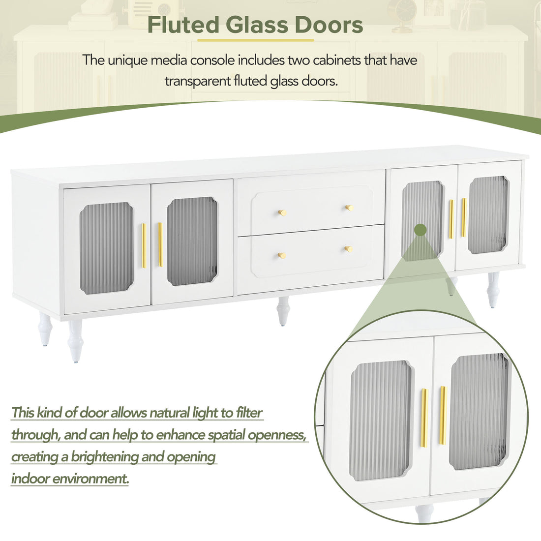 Retro Design Tv Stand With Fluted Glass Doors For Tvs Up To 78'', Practical Media Console With 2 Drawers And Cabinets, Elegant Entertainment Center For Living Room, White White Primary Living Space 70 79 Inches 70 79 Inches Particle Board