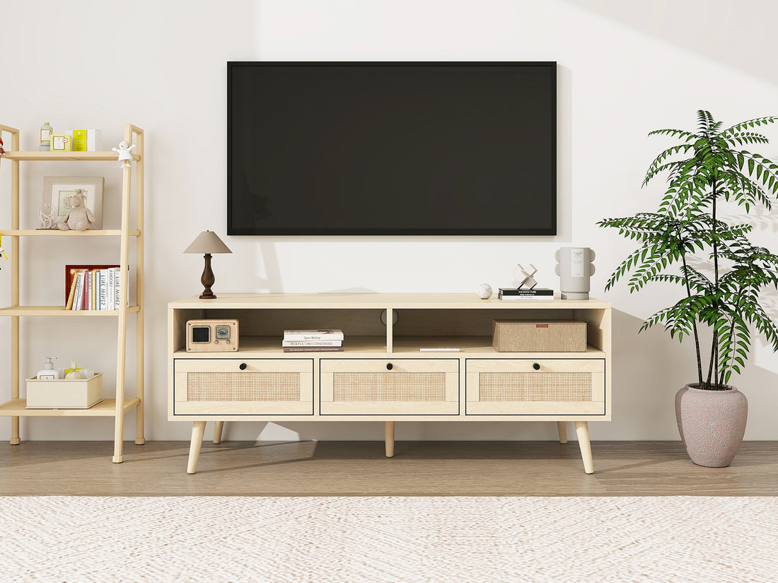 Rattan Tv Stand With Solid Wood Feet, Tv Console Table For Living Room, Natural Oak Particle Board