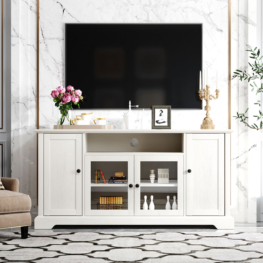 Tv Stand For Tv Up To 65In With 2 Tempered Glass Doors Adjustable Panels Open Style Cabinet, Sideboard For Living Room, White White Mdf