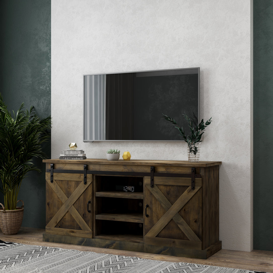 Farmhouse 66 Inch Tv Stand Console For Tvs Up To 80 Inches, No Assembly Required, Barnwood Finish Brown Brown Primary Living Space 60 69 Inches 80 89 Inches Farmhouse,Lodge,Rustic Alder 80 Inches