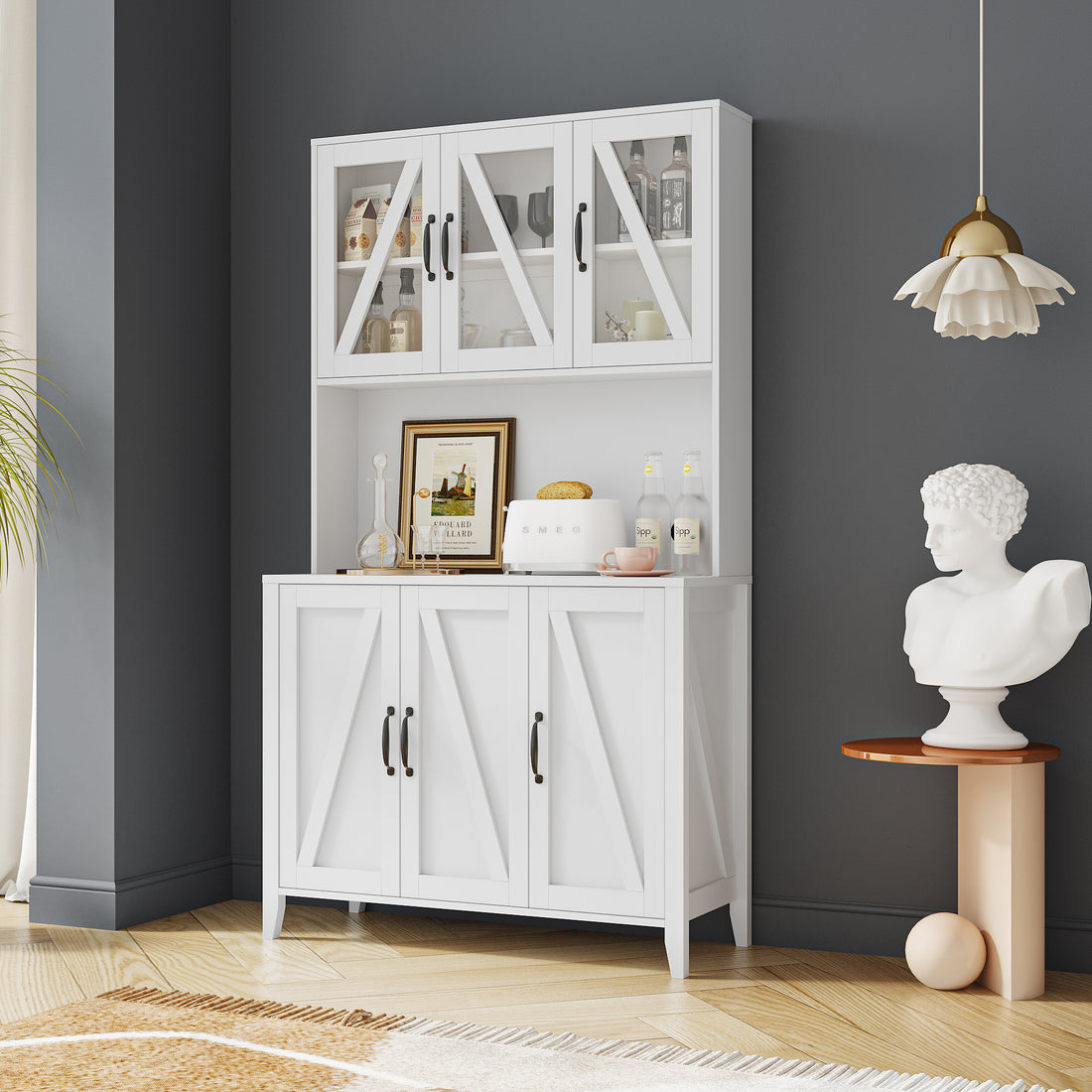 Large Kitchen Pantry Storage Cabinet With Glass Doors, Drawers & Open Shelves, Freestanding Kitchen Cupboard Buffet Cabinet For Living Room White Mdf