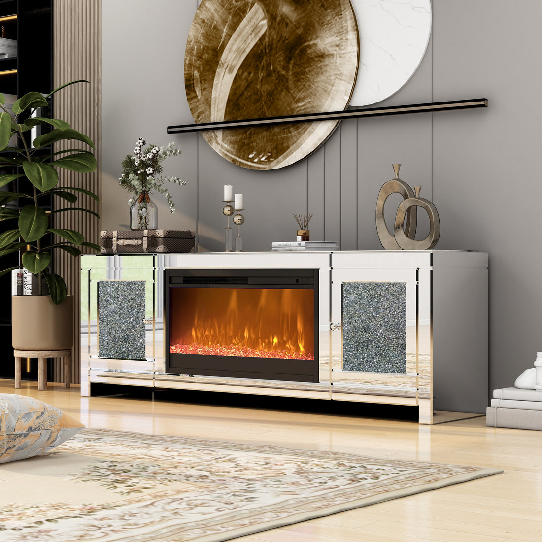 Mirror Glass Tv Stand With Electric Fireplace, Crystal Decor Doors, 7 Colors Choosen, Remote Control, 8H Timing Silver 60 69 Inches Mdf Glass