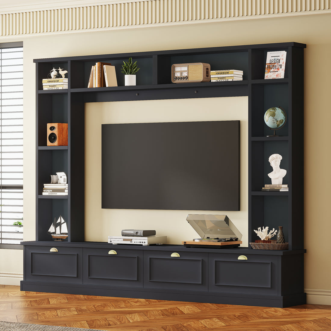 Large Wall Unit Entertainment Center With Bookshelves For Tvs Up To 78'', Modern Tv Console With Cabinets And Open Shelves, 4 In 1 Tv Stand With Golden Handles, Black, 104.2''W*81.2''H Black 70 79 Inches Mdf