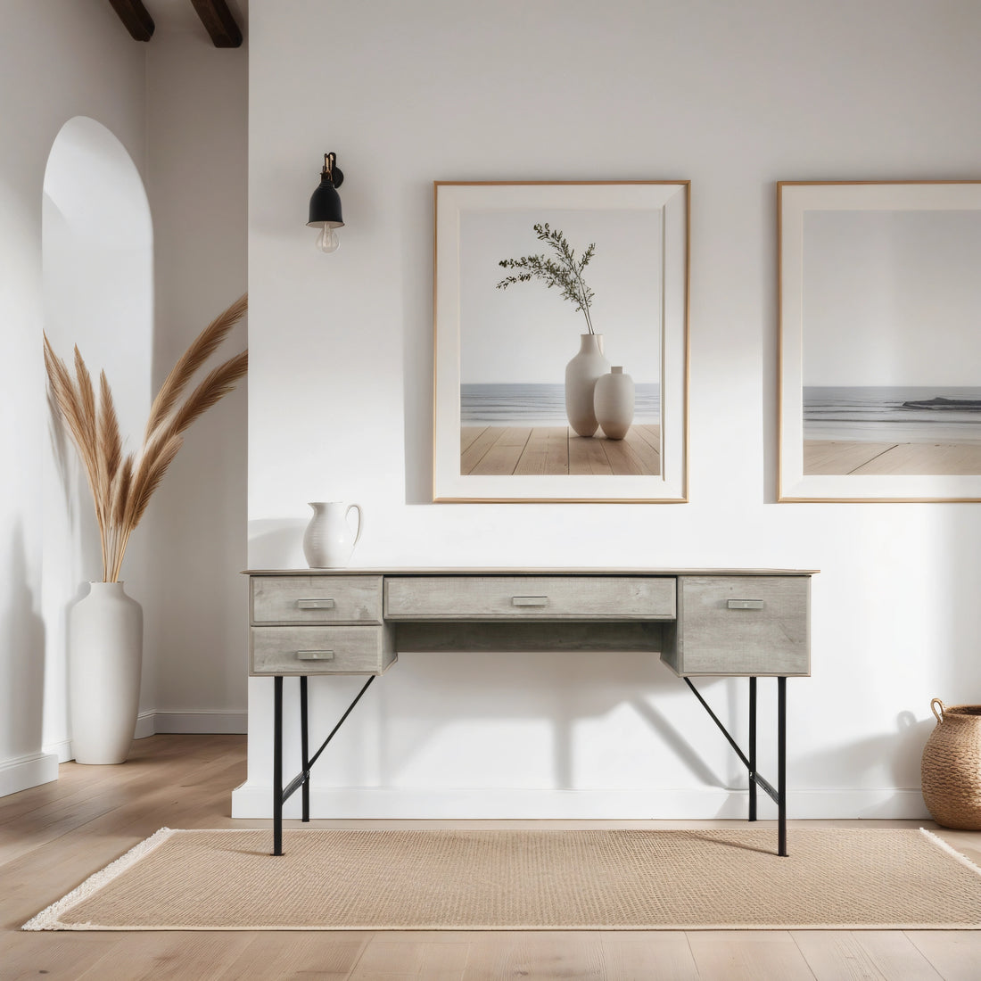 59" Writing Desk "Washed Gray Writing Desk Computer Table With Keyboard Tray, Power Cord Management, And Multiple Drawers For Home Office" Gray Wash Solid Wood