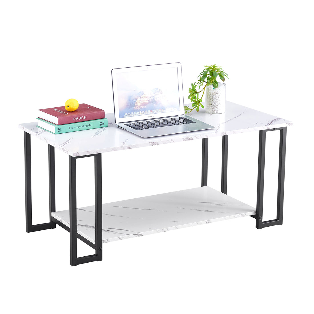 D&N Coffee Table, 2 Layers 1.5Cm Thick Marble Mdf Rectangle 39.37" L Tabletop Iron Coffee Tabledining Room, Coffee Shop, Resterant, White Top, Black Leg White Mdf