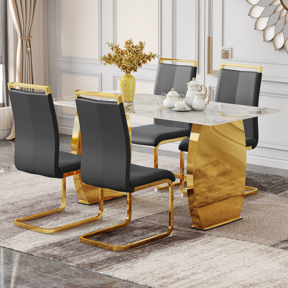 Large Modern Minimalist Rectangular Dining Table With 0.39 "Imitation Marble Black Tabletop And Golden Metal Legs, Paired With Chairs With Pu Cushions And Black Metal Legs. F 1537 C 007 Black Gold Glass Metal