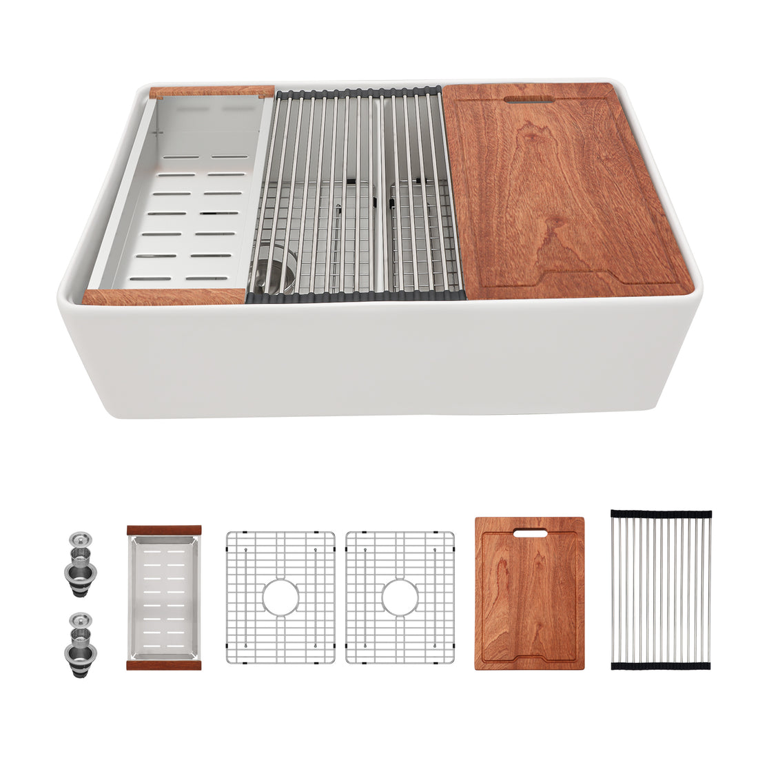 White Farmhouse Sink Workstation 33 Inch White Ceramic Double Bowl Farm Kitchen Sink White Ceramic