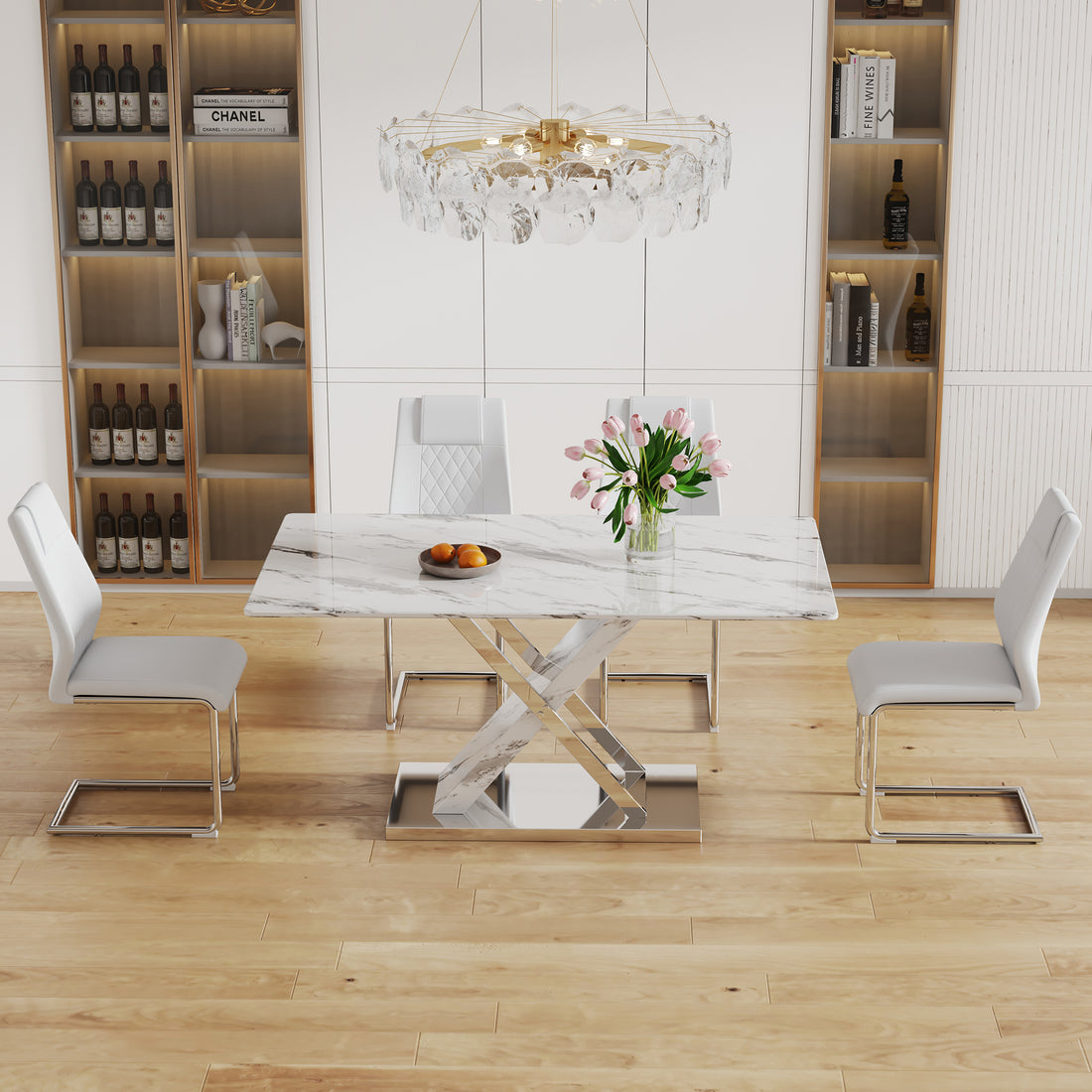 Table And Chair Set, Modern Dining Table, Imitation Marble White Top And Silver Legs, Soft And Comfortable Dining Chair, Perfect For Dinner, Meetings, Home And Office Decor White Silver Glass Metal