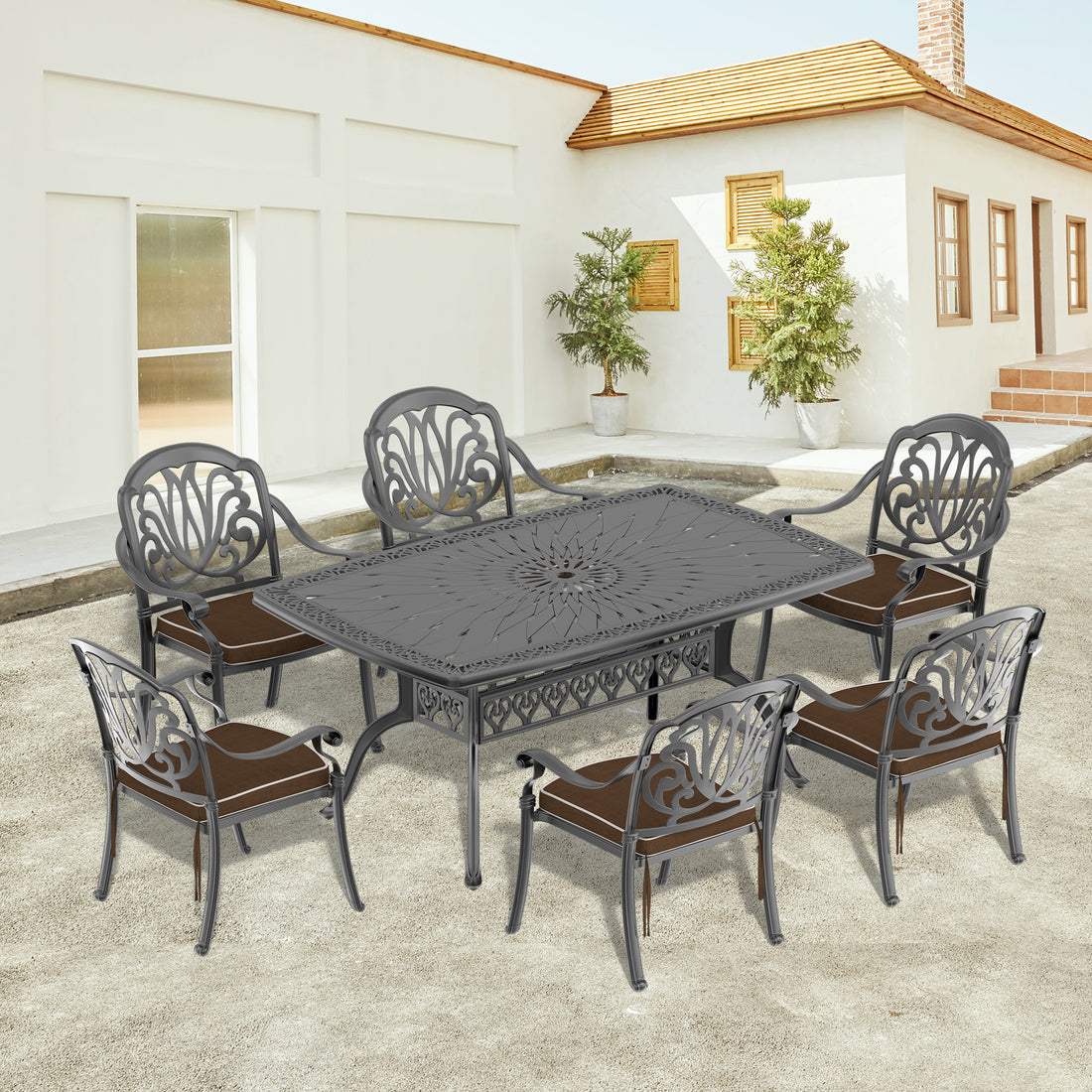 Cushions In Random Colors 7 Piece Set Of Cast Aluminum Patio Furniture With Cushions Yes Dining Set Black Seats 6 Rust Resistant Frame Water Resistant Cushion Garden & Outdoor Complete Patio Sets Aluminium