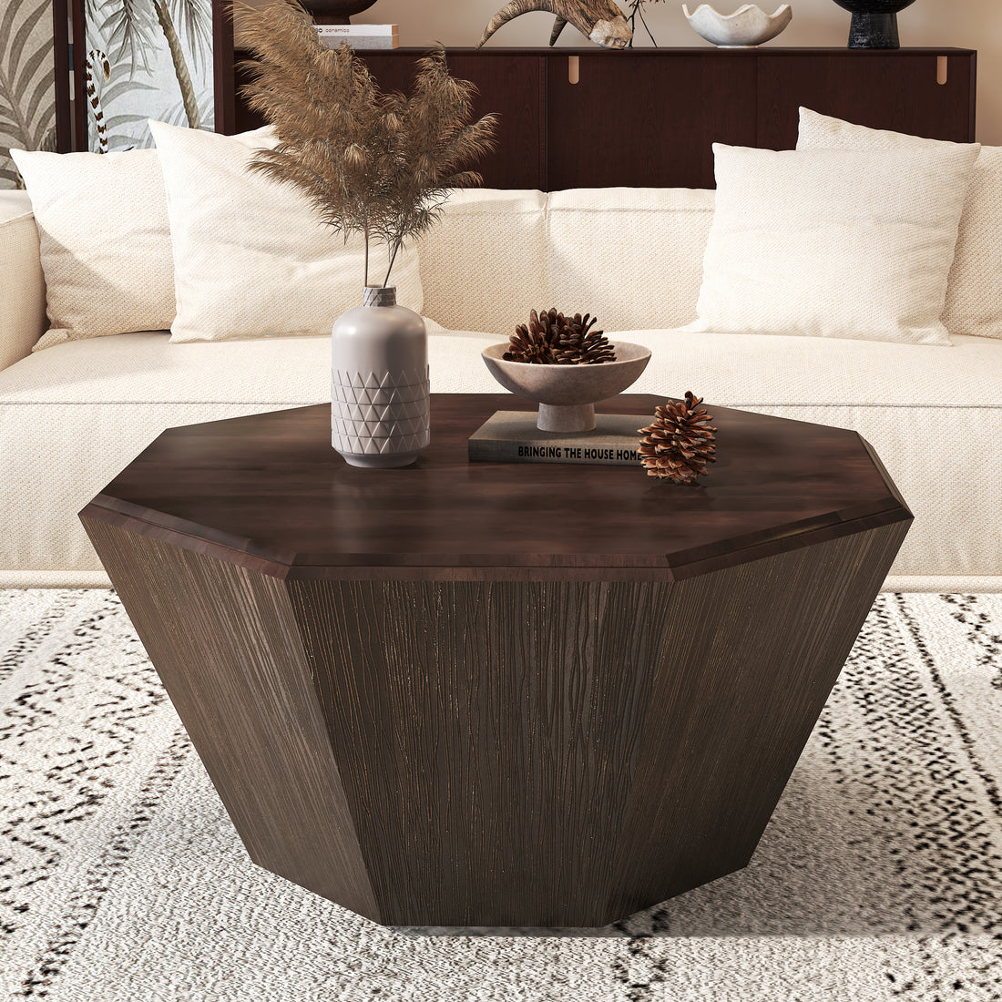 31.5 "Octagonal Black Walnut Rubber Wood Coffee Table, Coffee Table, Living Room Bedroom Walnut Rubber Wood