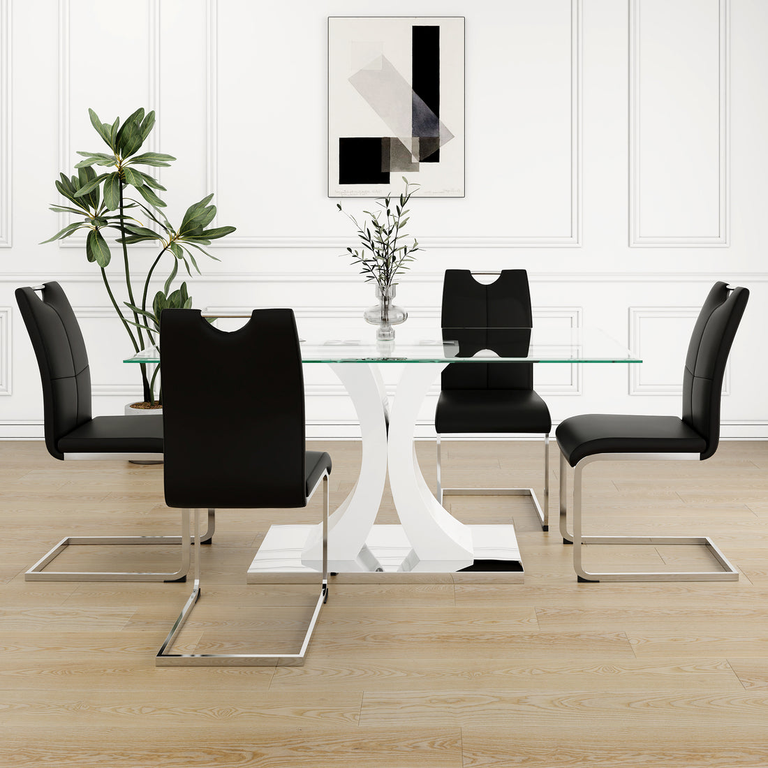 Modern Style Glass Table, Elegant Transparent Design, Durable Support Base, Black Dining Chair Set, Electroplated Chair Legs, Suitable For Restaurant Kitchens Set Of 5 Black Silver Seats 4 Mdf Glass