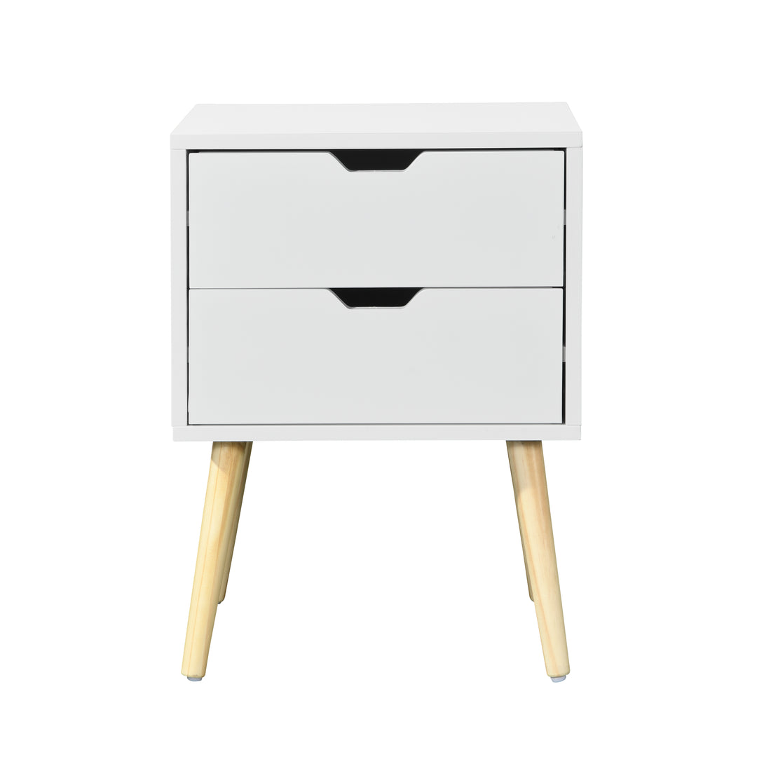 Side Table With 2 Drawer And Rubber Wood Legs, Mid Century Modern Storage Cabinet For Bedroom Living Room Furniture, White White Mdf