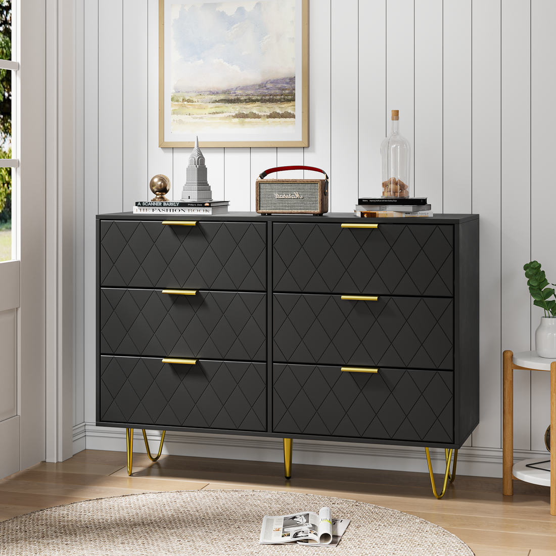 Modern Black 6 Drawers For Bedroom, Small Size Modern 6 Drawer Dresser, Wide Chest Of Drawers With Gold Handles, Wood Double Dresser Storage Cabinet For Living Room, Bedroom, Hallway Black Bedroom Mdf