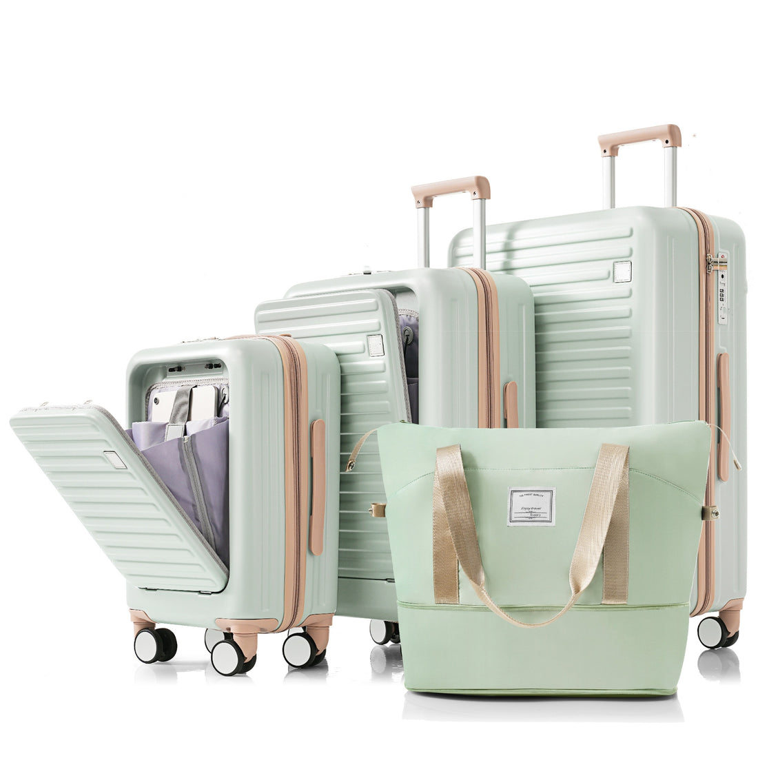Luggage Set Of 4 With Usb Port, 20, 24Inch With Front Opening Design Airline Certified Carry On Luggage With Cup Holder, Abs Hard Shell Luggage With Expandable Travel Bag, Grey Green Green Abs