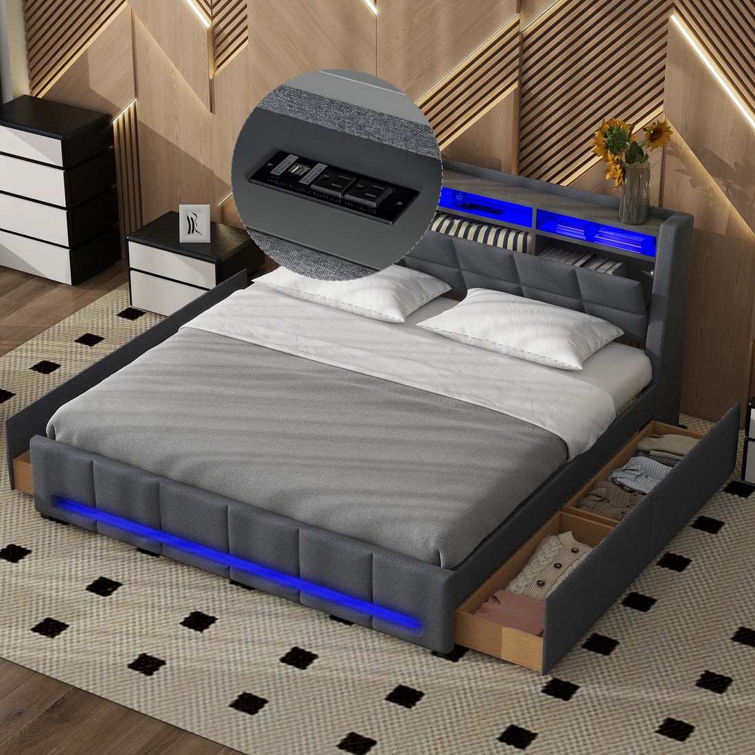 Queen Size Upholstered Platform Bed With Storage Headboard, Led, Usb Charging And 4 Drawers, Gray Queen Box Spring Not Required Gray Wood Linen Upholstered