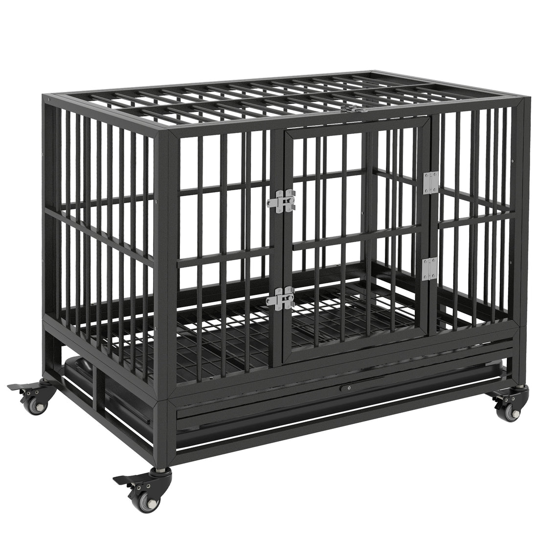 Pawhut 36" Heavy Duty Dog Crate Metal Cage Kennel With Lockable Wheels, Double Door And Removable Tray, Gray Grey Steel