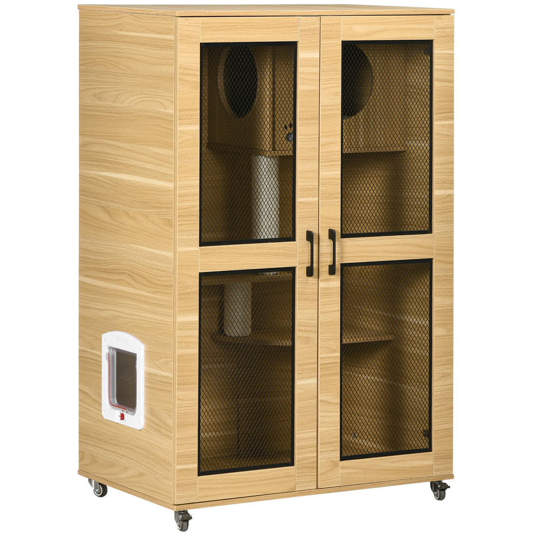 Pawhut Luxury Cat House With Wheels, Kitty Cage Catio Villa For Indoor Cats With Scratching Posts, Condo, Flap Door, Cushion, Oak, 31.5" X 20" X 48.5" Oak Particle Board