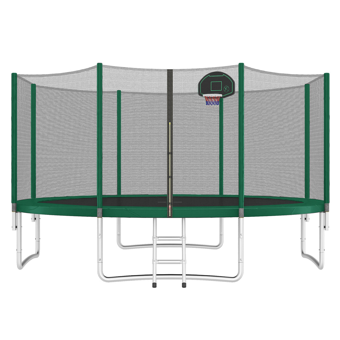 14Ft Trampoline For Kids With Safety Enclosure Net, Basketball Hoop And Ladder, Easy Assembly Round Outdoor Recreational Trampoline Green Metal