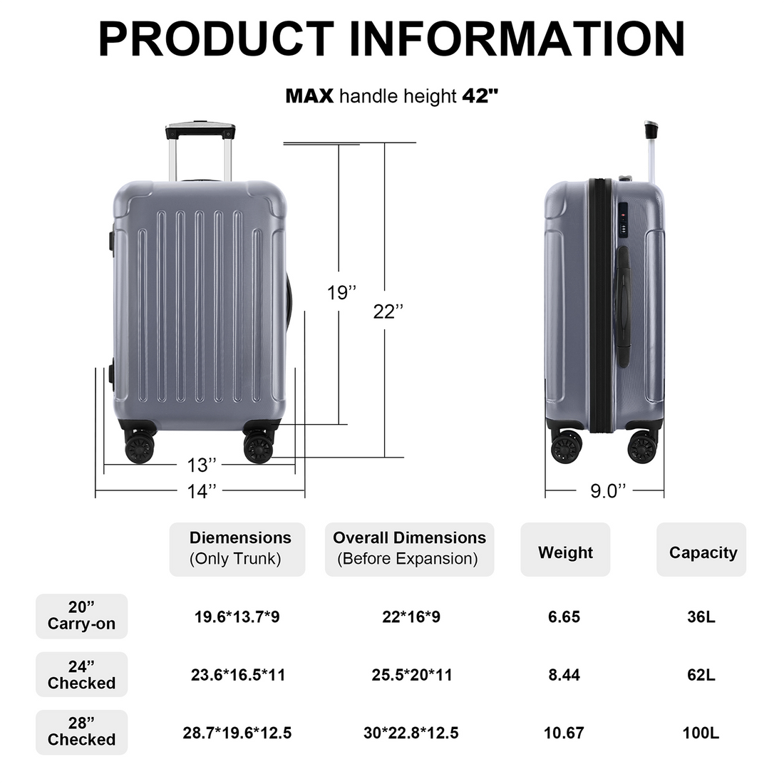 Name: Luggage Suitcase 3 Piece Sets Hardside Carry-on luggage with Spinner Wheels 20"/24"/28" Description: Humanized...