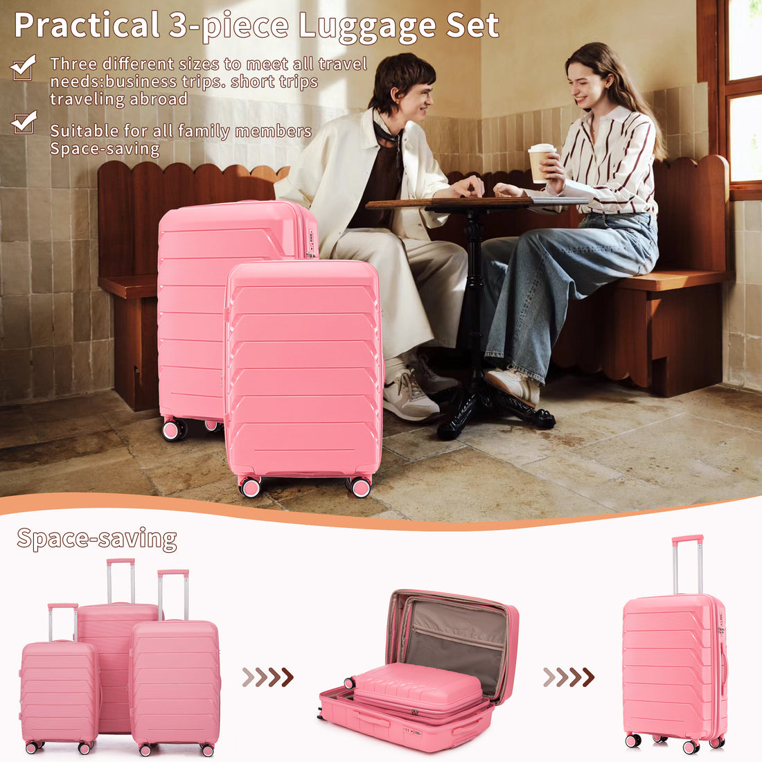 Pp Luggage Sets 3 Piece 20 24 28 , Expandable Carry On Luggage With Tsa Lock Airline Approved, Pp Materials Hard Shell And Lightweight Suitcase With Spinner Wheels Pink Pink Polypropylene