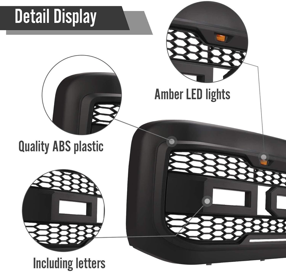 Front Grill For 1999 2000 2001 2002 2003 2004 Ford F250 F350 F450 Super Duty Raptor Style Grill With 3 Amber Led Lights & Letters Matte Black Matt Black Abs Abs