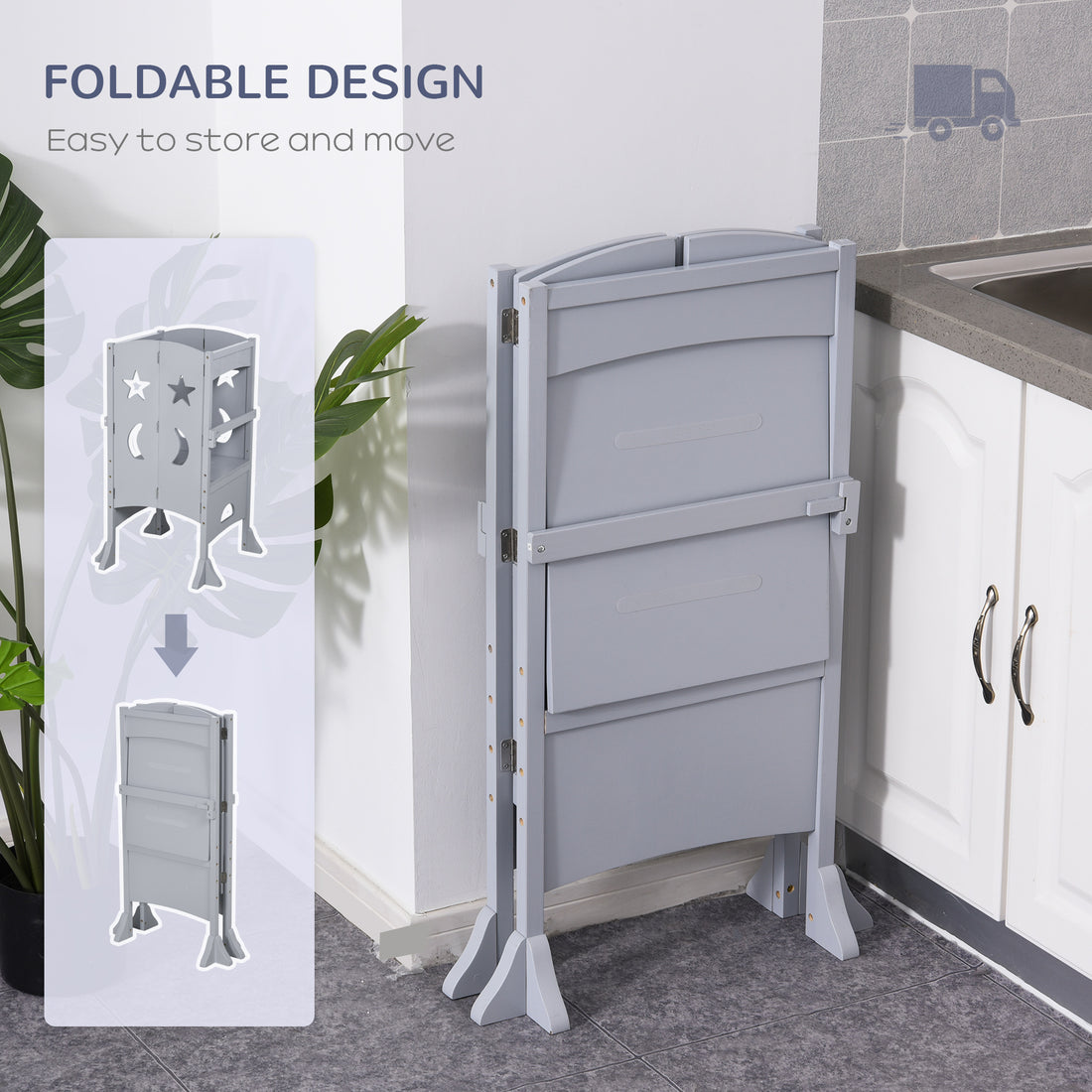Qaba Wooden Kitchen Step Stool For Kids, Foldable Toddler Tower, Helper Stool For Kitchen Counter With Support Handles Safety Rail, Gray Grey Mdf