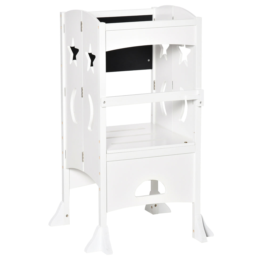 Qaba 2 In 1 Kids Foldable Kitchen Step Stool, Toddler Standing Tower With Chalkboard And Lockable Handrail For Children 3 6 Years Old, White White Mdf