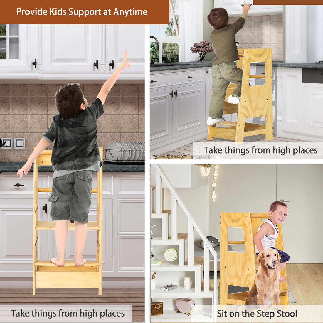 Toddler Standing Tower Kitchen Step Stool For Kid'S Adjustable Height Learning Stool, Toddler Kitchen Stool Helper Removable Anti Drop Safety Rail Stool For Bedroom, Bathroom, Natural Natural Wood