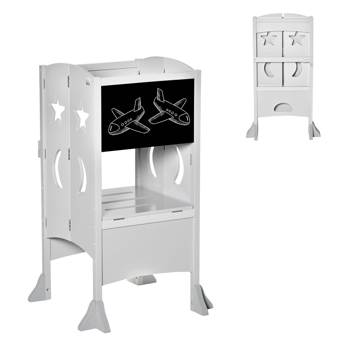 Kids Kitchen Step Stool Foldable Child Standing Tower With Chalkboard. Lockable Handrail For Children 3 6 Years Old, Grey Gray Mdf
