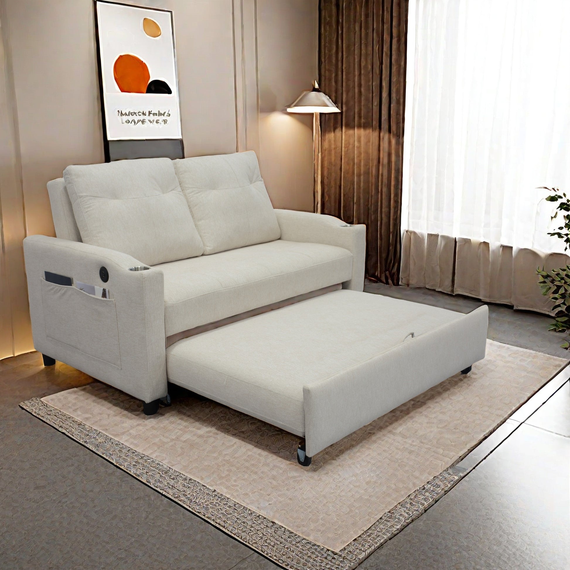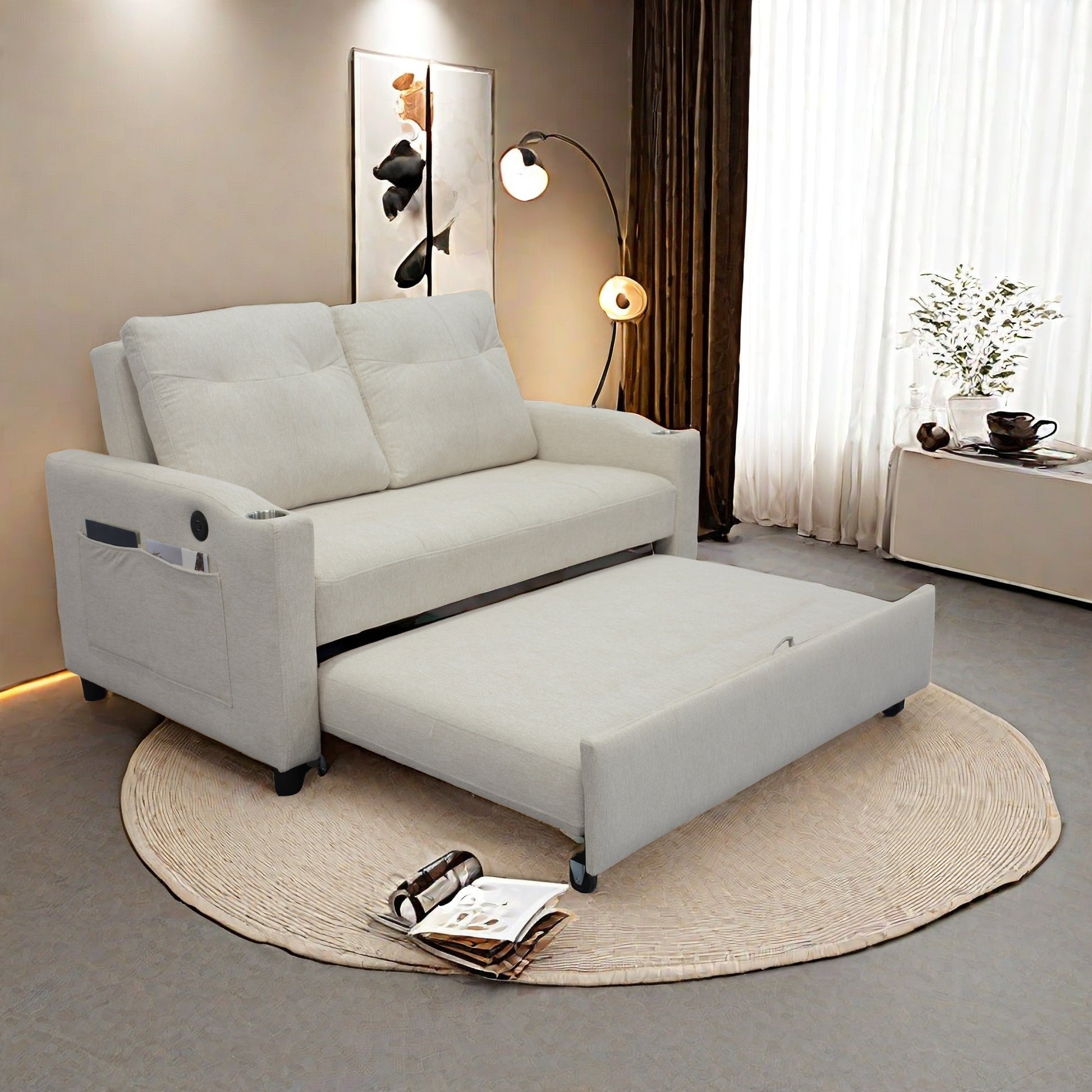 1 Versatile Foldable Sofa Bed In 3 Lengths, Modern Sofa Velvet Pull Out Bed, Adjustable Back And With Usb Port And Ashtray And Swivel Phone Stand Beige Sleep Sofa Beige Linen Wood Primary Living