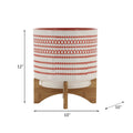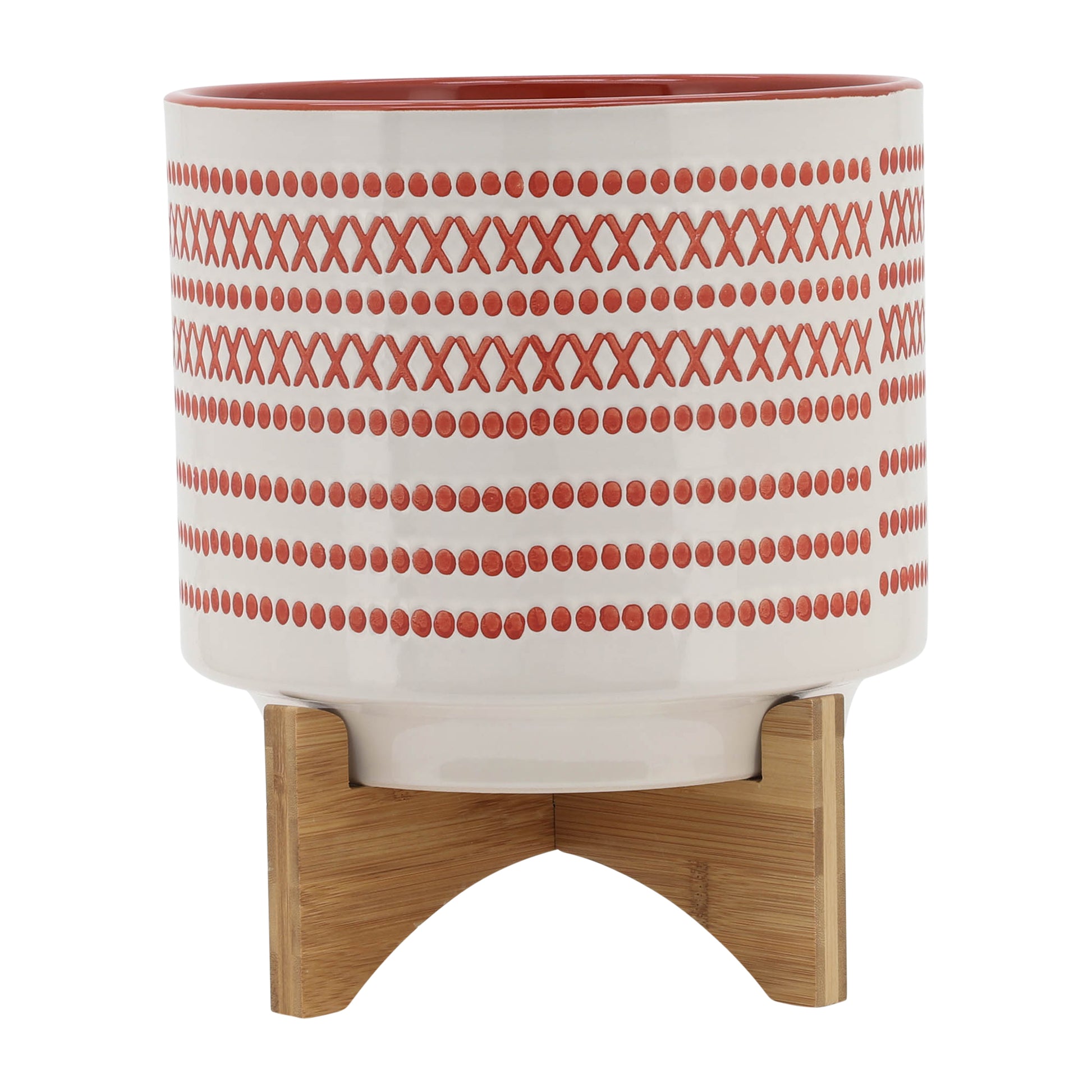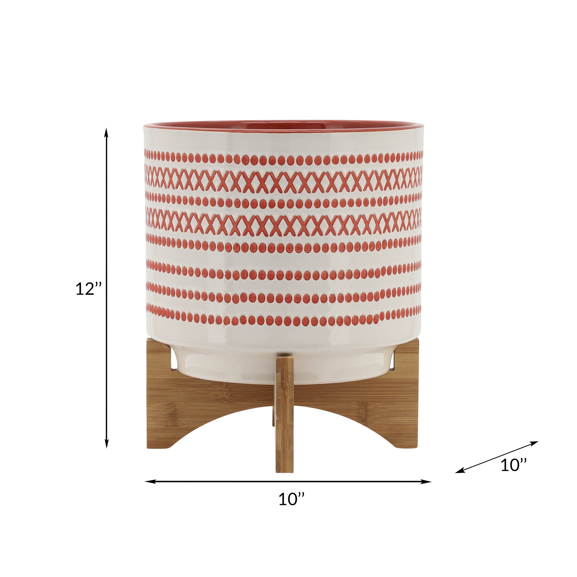 10" Aztec Planter W Wood Stand, Orange Orange Ceramic