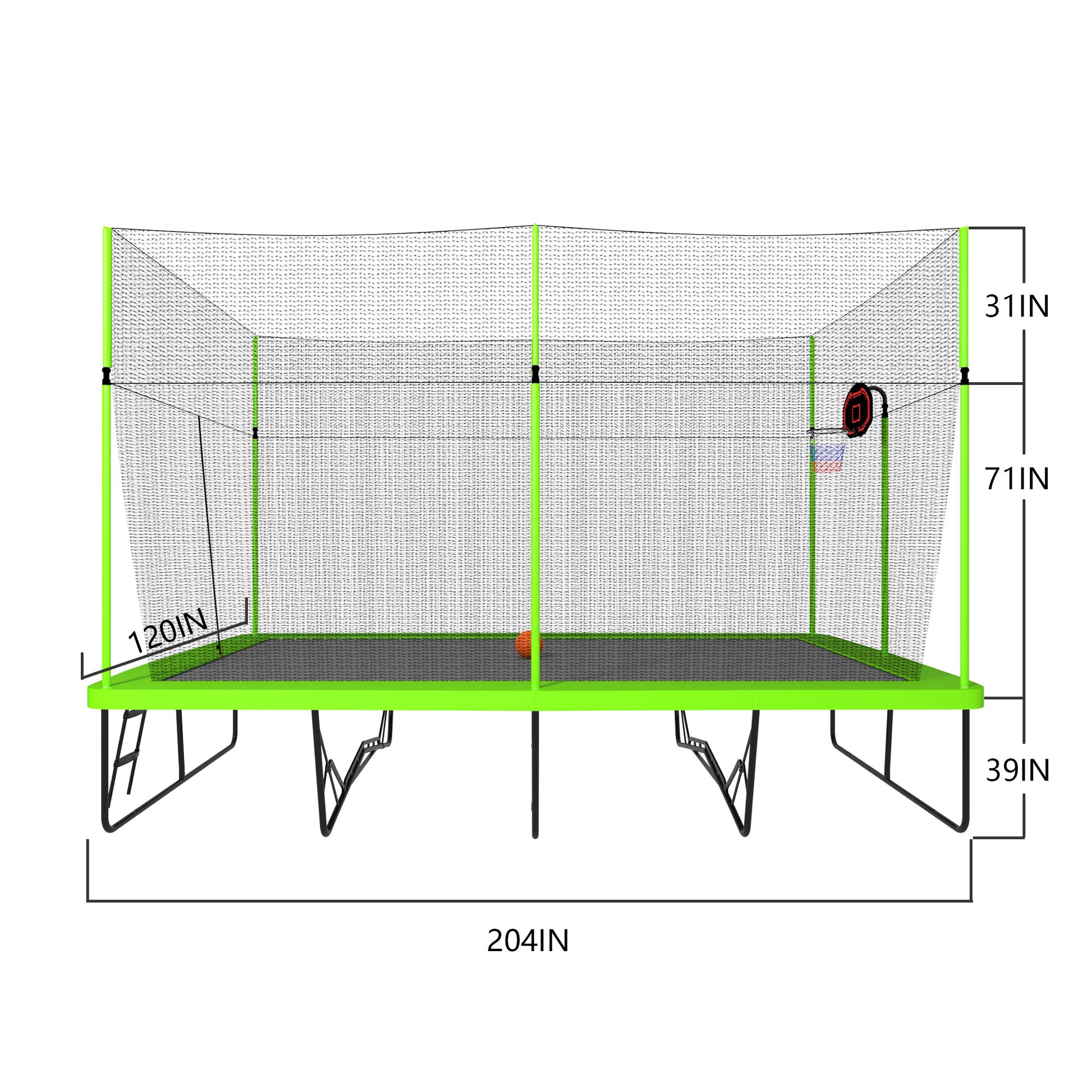 10Ft By 17Ft Rectangule Trampoline With Green Fabric Black Powder Coated Galvanized Steel Tubes With Basketball Hoop System Advanced Ladder Green Steel