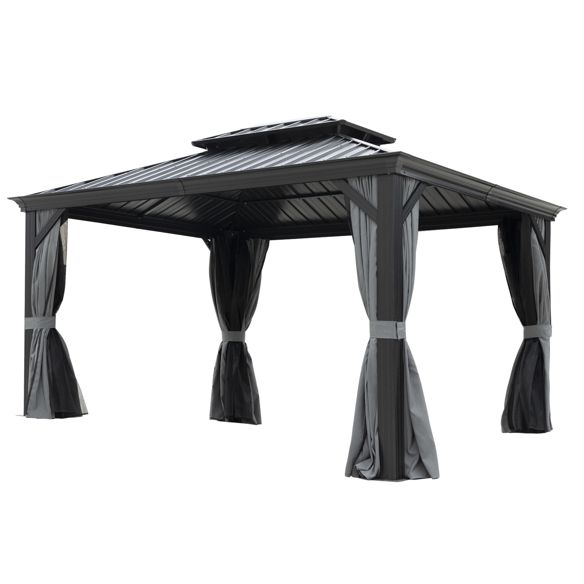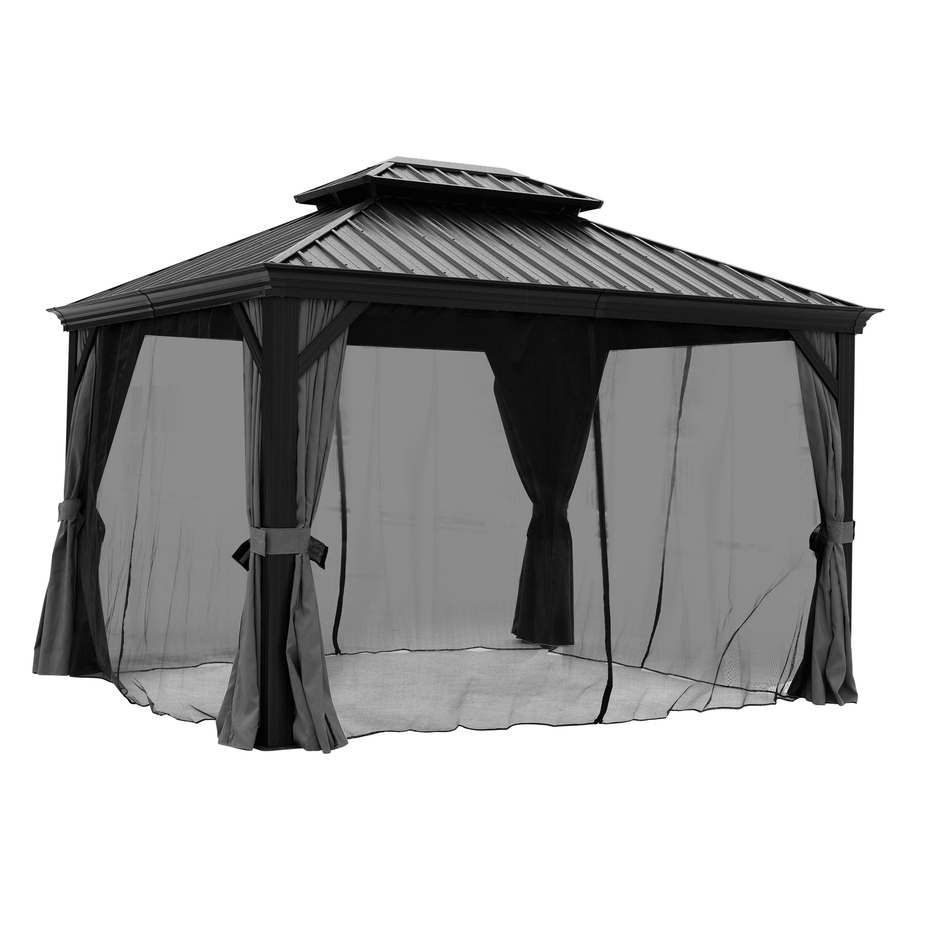10X12Ft Hardtop Gazebo With Netting & Curtain, Black Black Rectangular Garden & Outdoor Uv Resistant Gazebos Anchored Aluminium Alloy