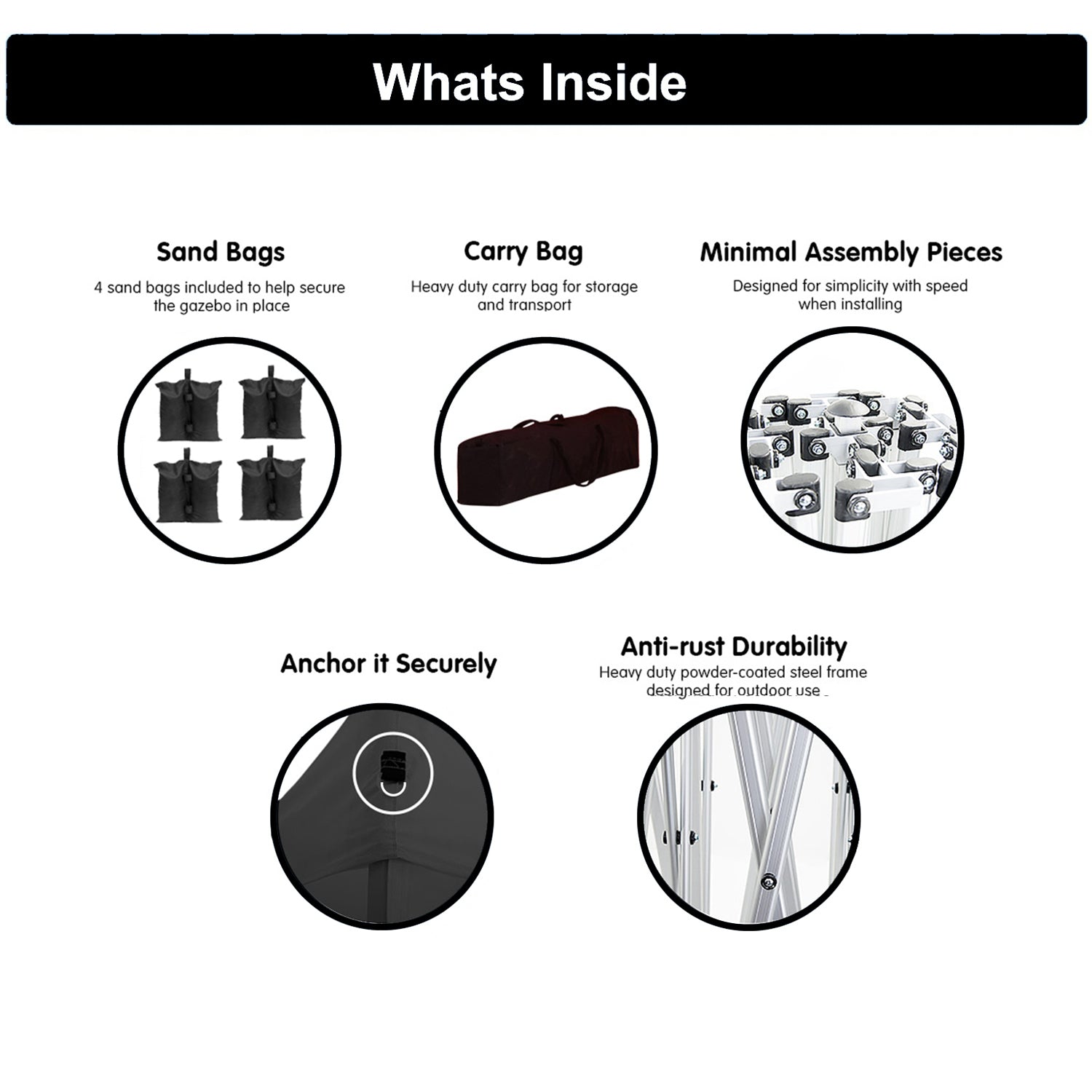 | Package | 1 x Frame1 x Canopy Top1 x Manual1 x Carry Bag4 x Weight Bags6 x Sidewalls6 x Tie Ropes12 x Stakes |