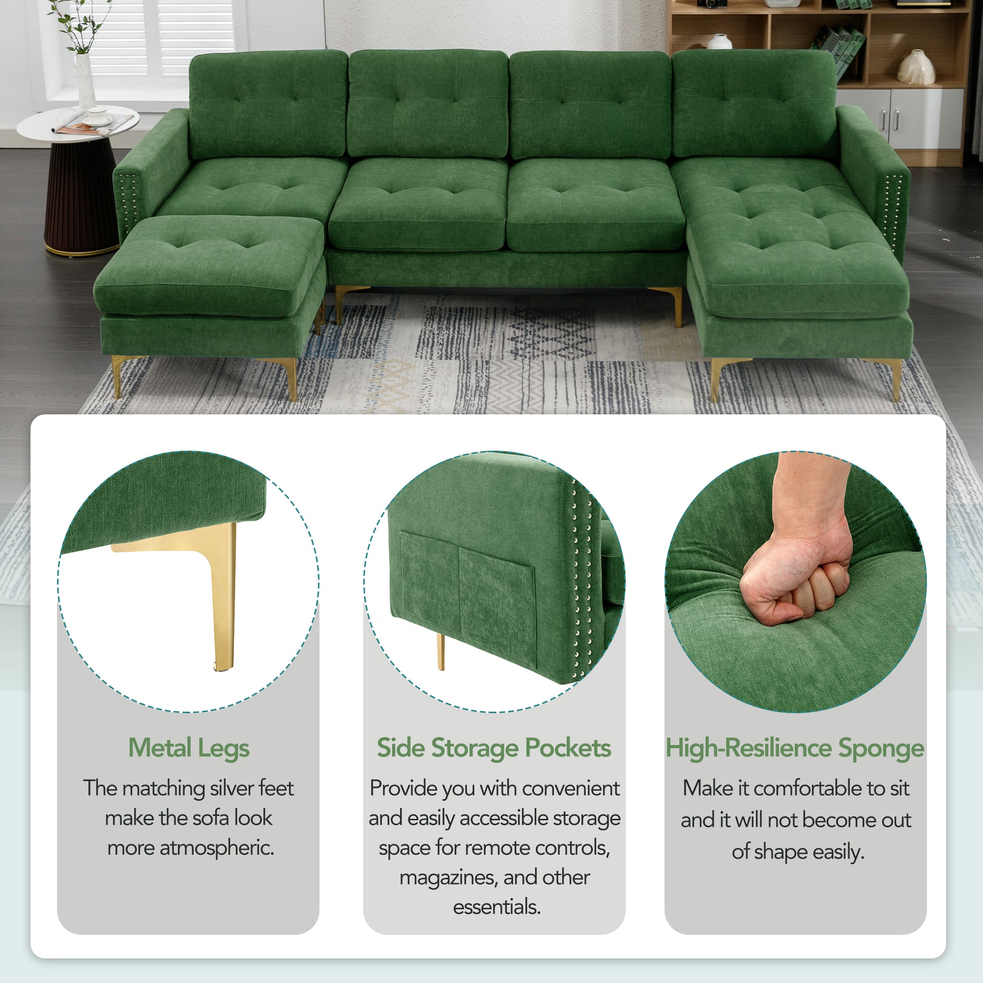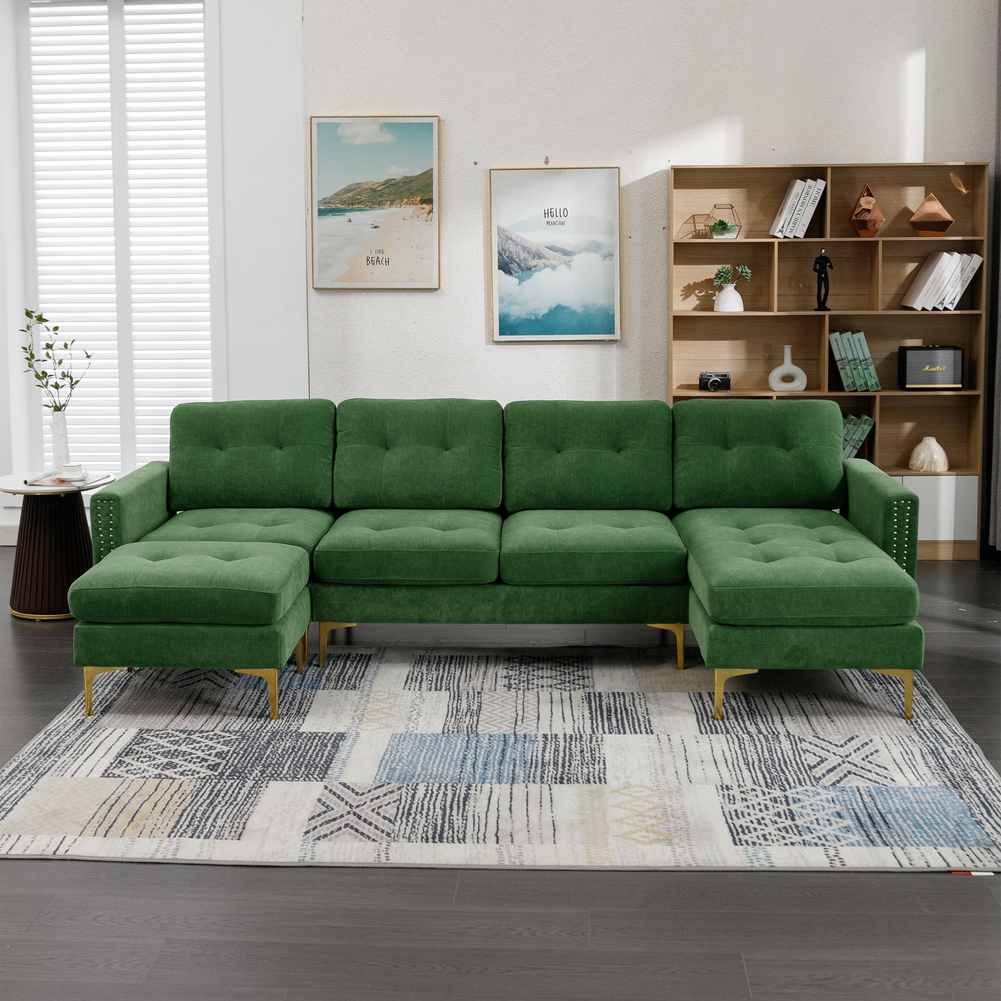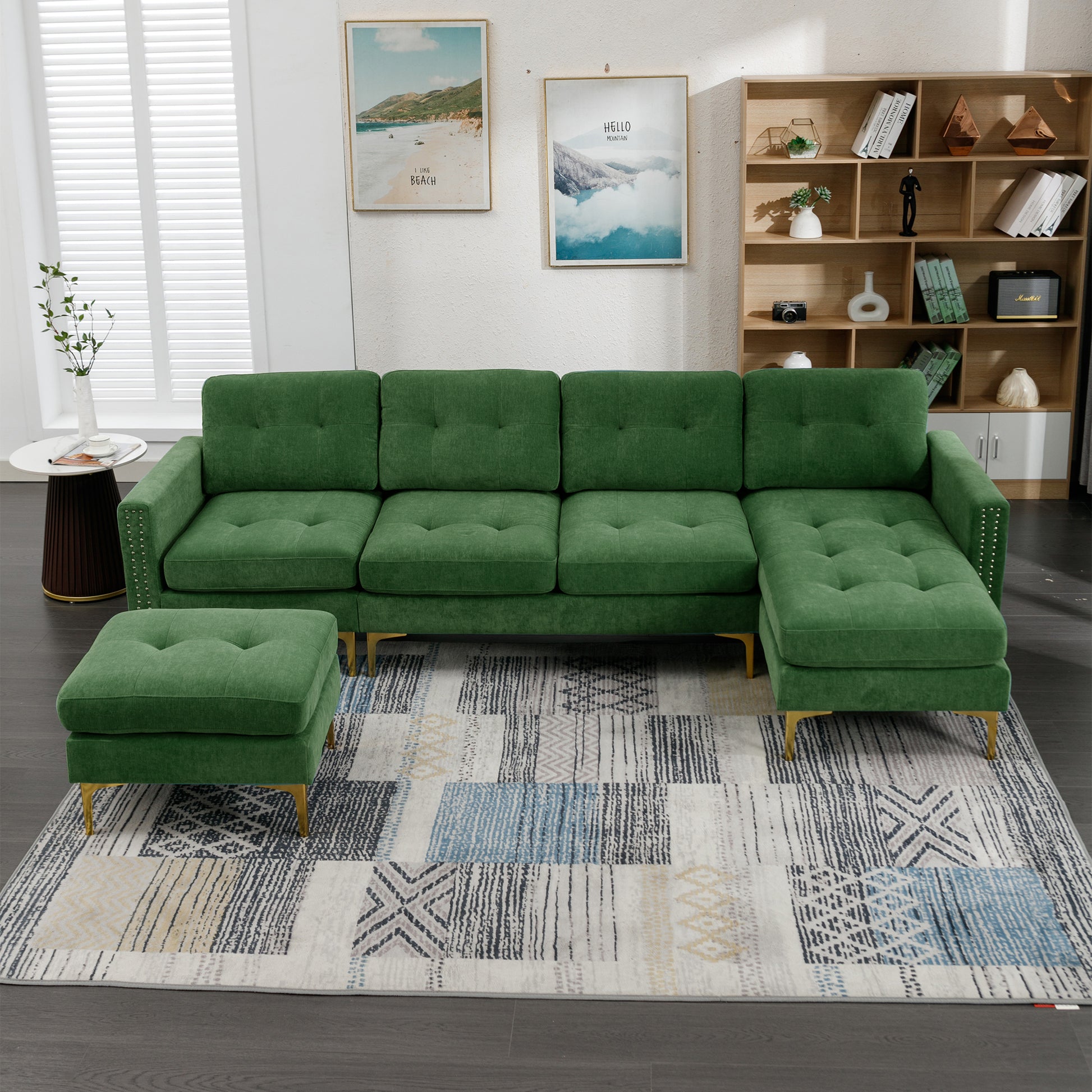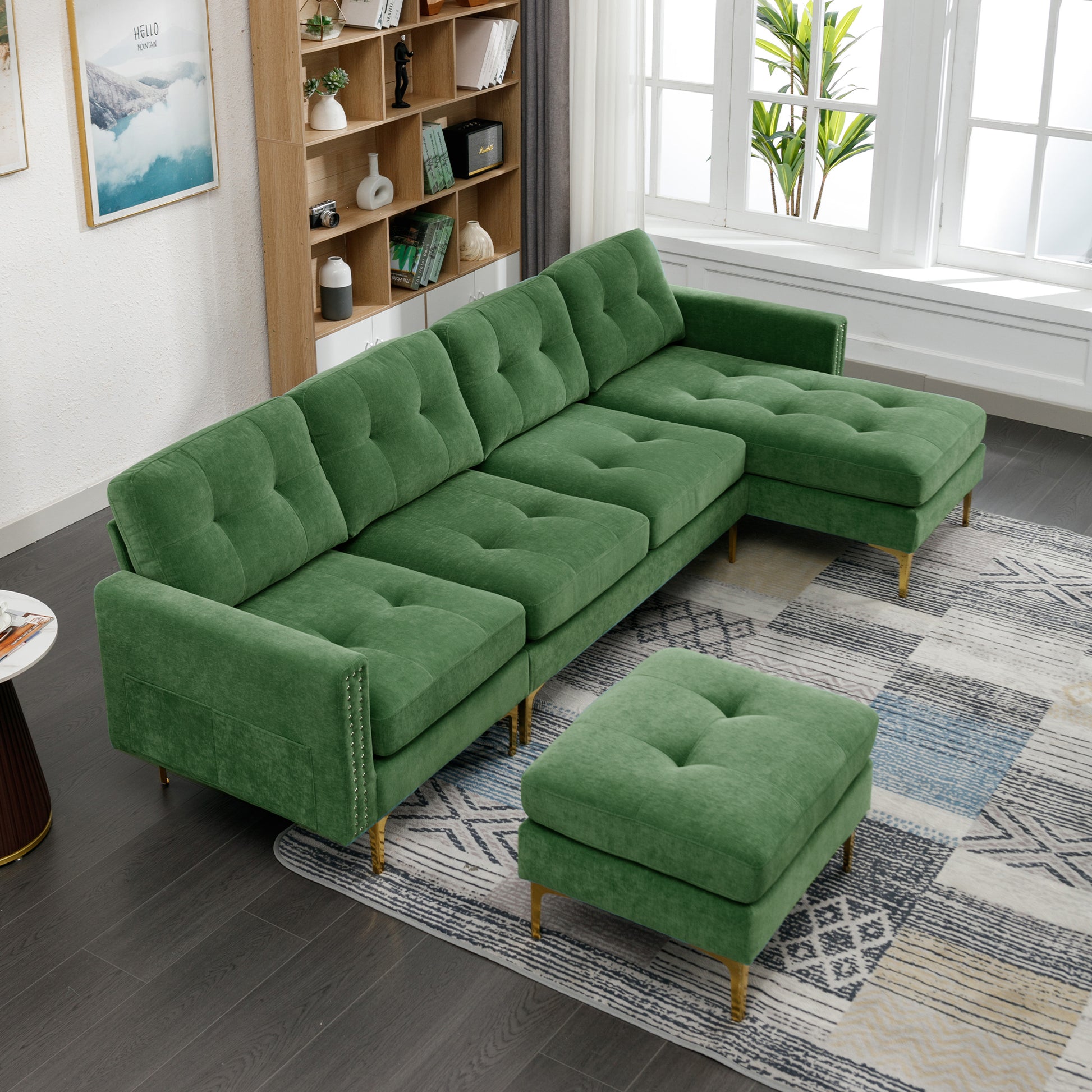110" L Shape Convertible Sectional Sofa Couch With Movable Ottoman For Living Room, Apartment, Office, Green Green Foam Velvet 4 Seat